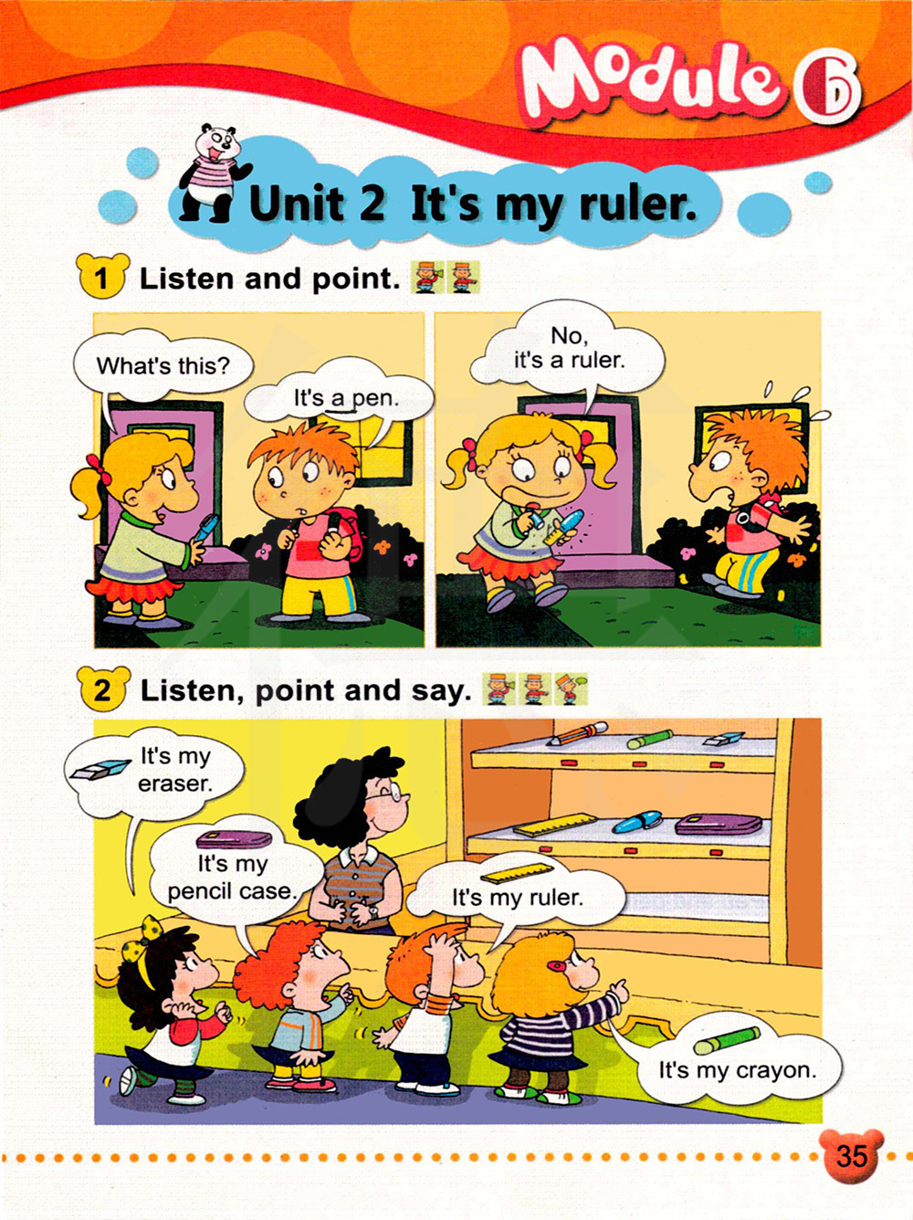 3.能听懂,会读句子:What’s this? What’s that? It’s my ruler/pencil case/eraser/crayon.