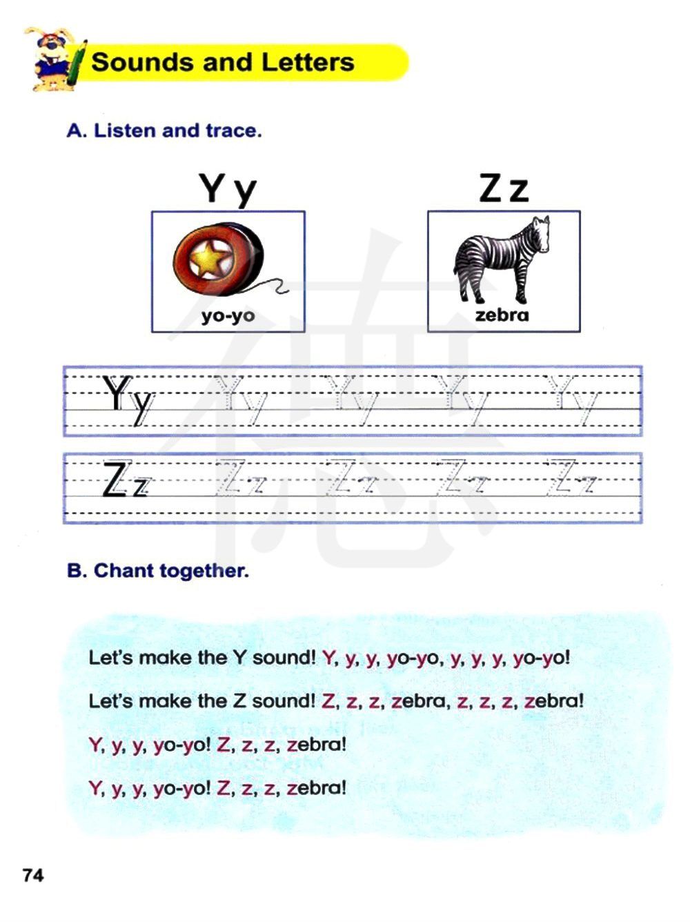 我来发Y的音!Y,y,y,溜溜球,y,y,y,溜溜球! 我来发Z的音!Z,z,z,斑马,z,z,z,斑马!Y,y,y,溜溜球!Z,z,z,斑马!Y,y,y,溜溜球!Z,z,z,斑马!Y,y,y,yo—yo!Z,z,z,zebra!