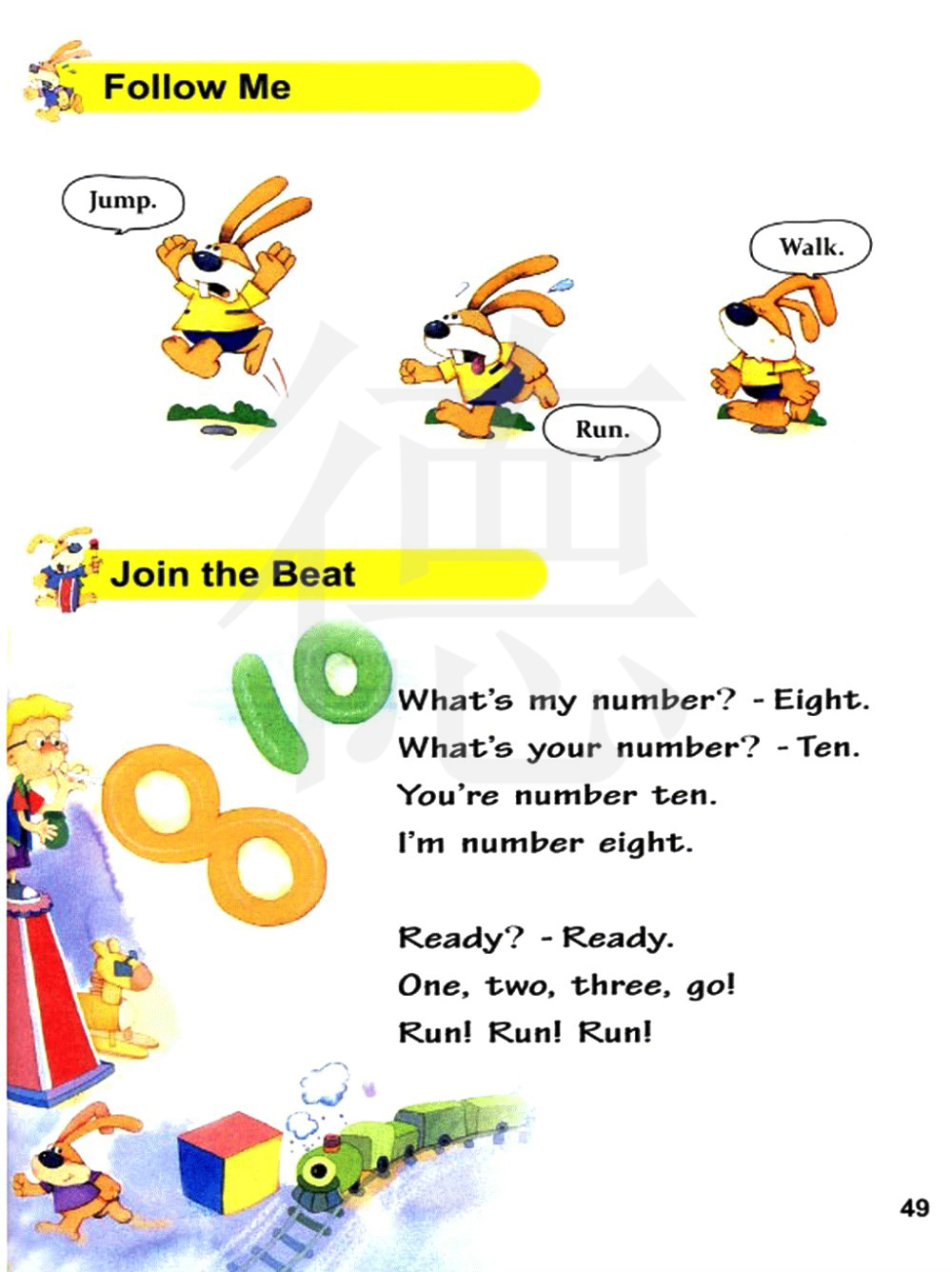 我是几号?八号。你是几号?十号。你是十号。我的号码是八。准备好了吗?准备好了。一、二、三。跑! 跑!跑!跑!