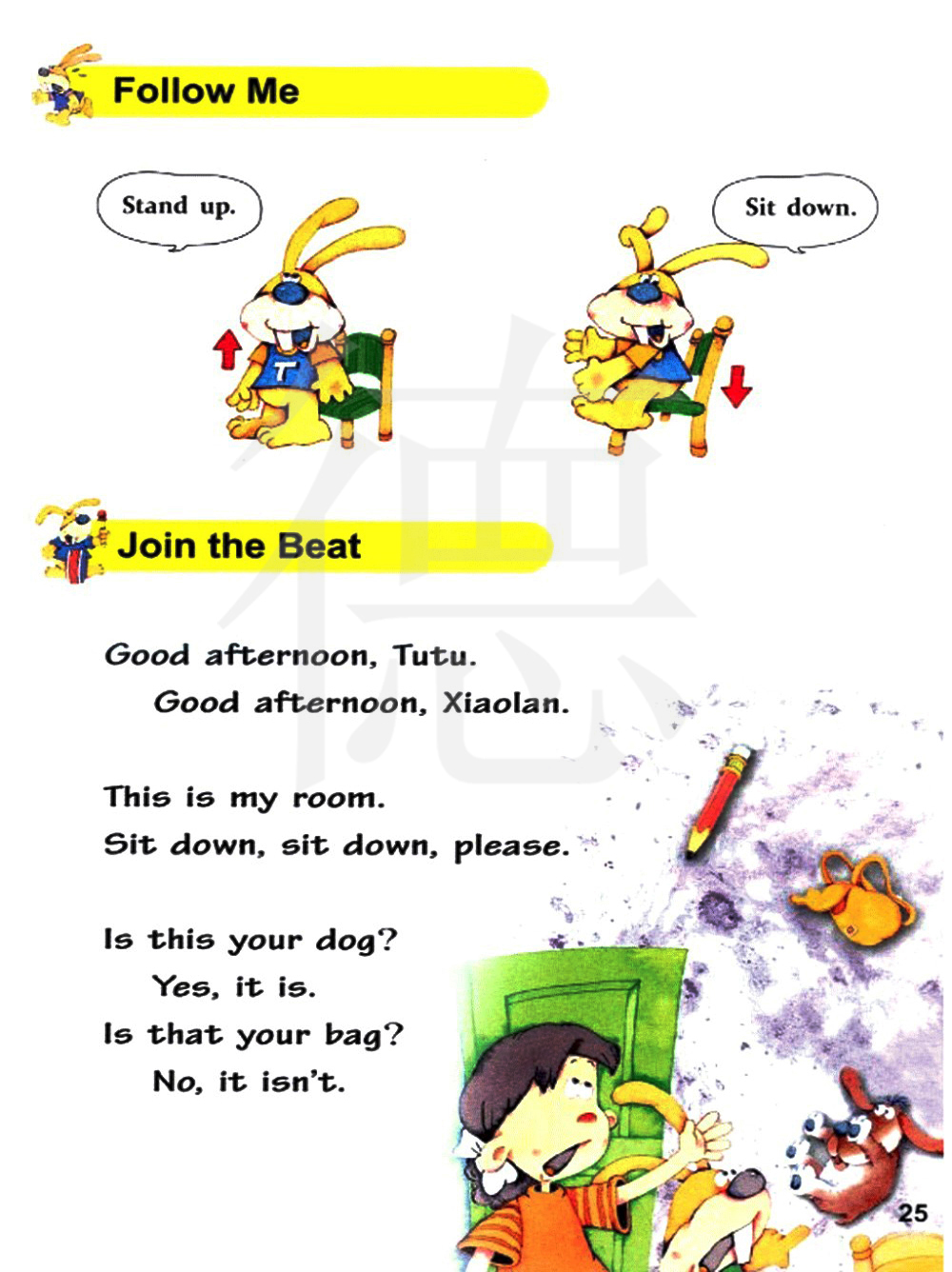 下午好,兔兔。下午好,小兰。 这是我的房间。请坐,请坐。 这是你的狗吗?是的。那是你的书包吗?不是的。