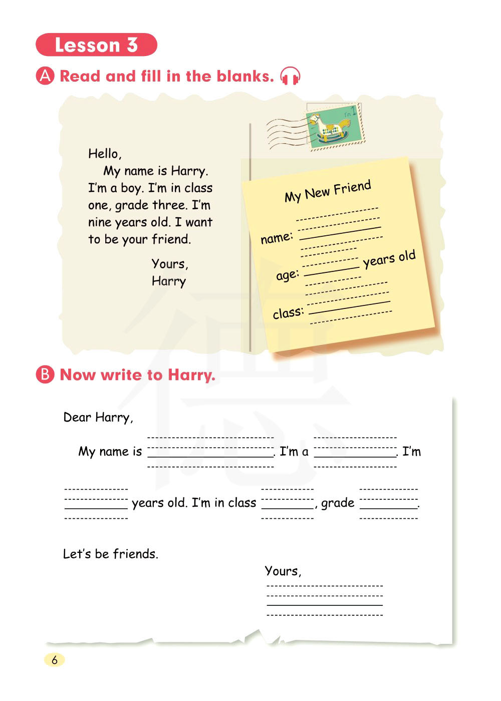 你好:我的名字叫哈利,我是一个男孩,我在三年级一班,我九岁了,我想成为你的朋友。你的,哈利