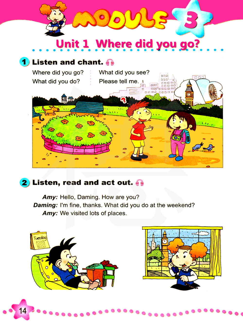 你好,大明。你好吗? 我很好,谢谢。你们周末做了什么? 我们参观了很多地方。