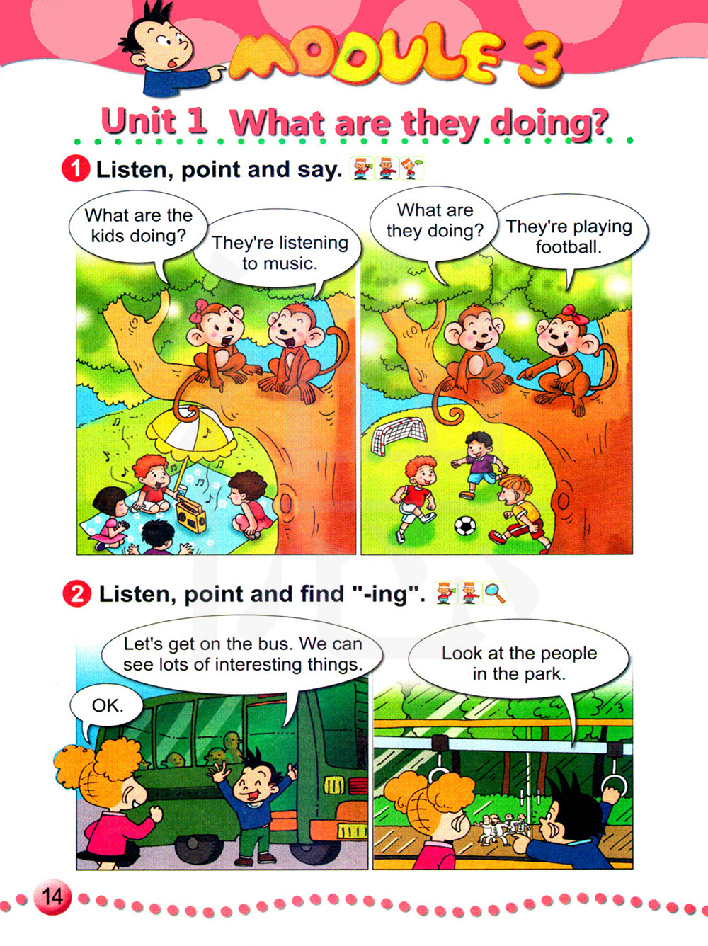 本模块的学习重点是现在进行时的特殊疑问句,其结构并不难,教师可同时重点帮助学生巩固现在分词的构成。