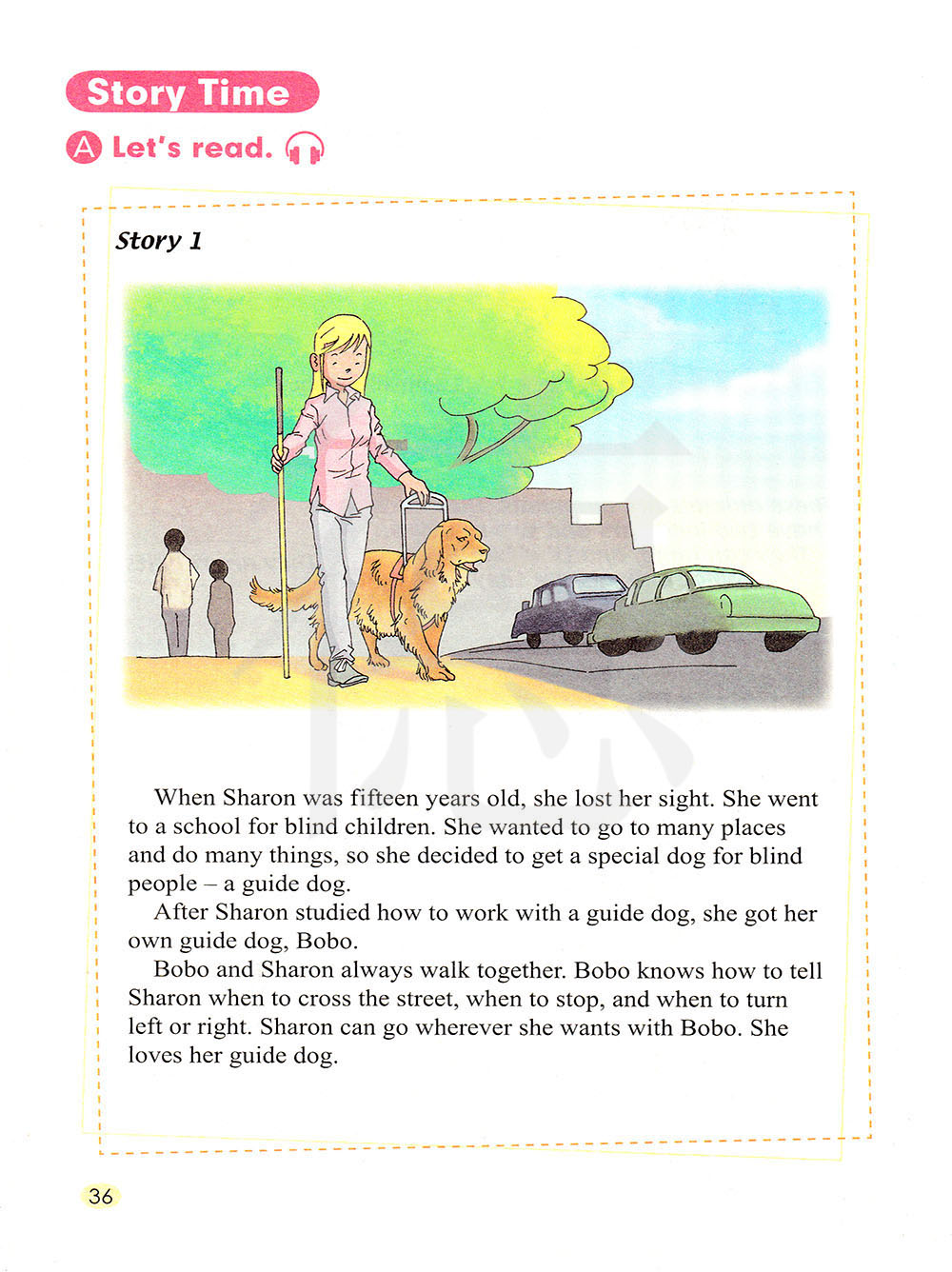 波波和莎伦总是走在一起。波波懂得如何告诉莎伦过马路,什么时候停下来,什么时候左转或右转。跟波波一起,莎伦可以去任何想去的地方。她很喜欢她的导盲犬。