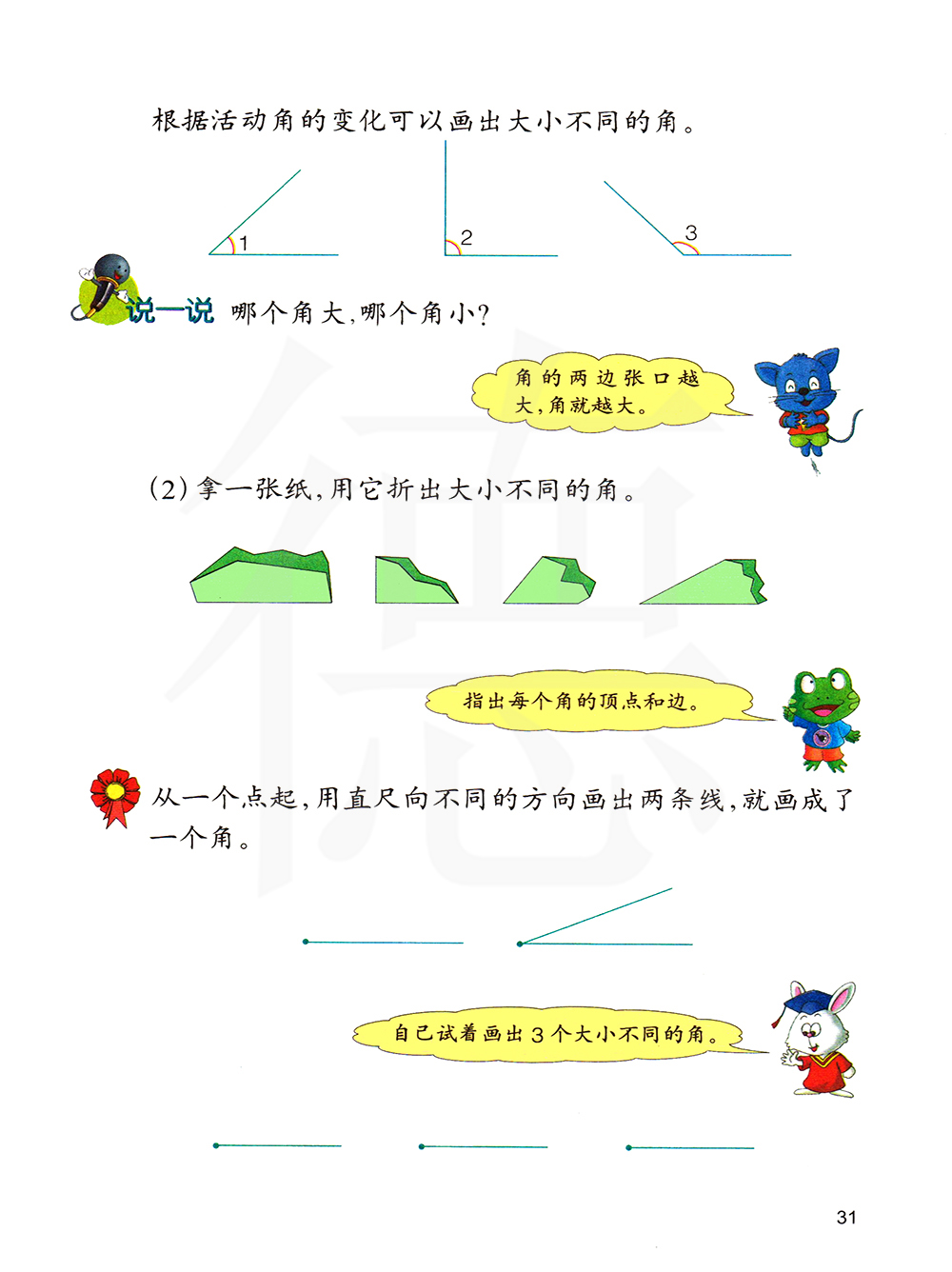 3、角的大小比较:理解角的大小与边的长短无关,与两条边叉开的大小有关,叉开的越大,角越大