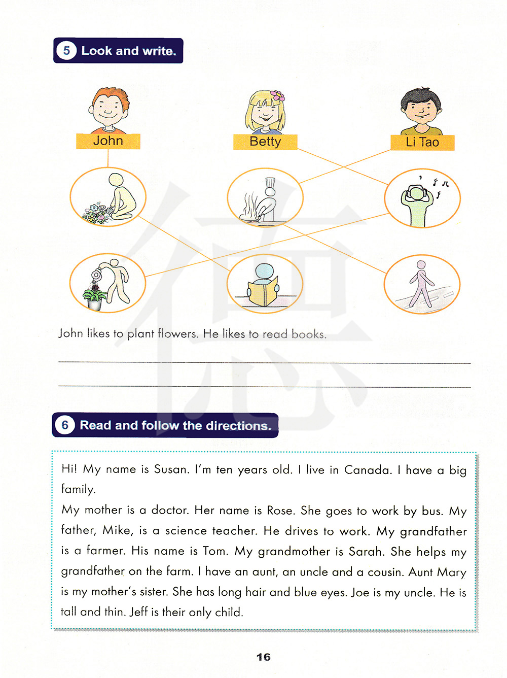 我的妈妈是一名医生。她的名字叫罗斯。她乘公交车去工作。我的爸爸,麦克,是一名科学老师。他开车去工作。我的爷爷是一名农民。他叫汤姆。我的奶奶是萨拉。她在农场帮助我的爷爷。我有一个阿姨,一个姨父和一个表弟。玛丽阿姨是我妈妈的妹妹。她有着长长的头发和蓝色的眼睛。乔是我的姨父。他很高很瘦。杰夫是他们唯一的孩子。