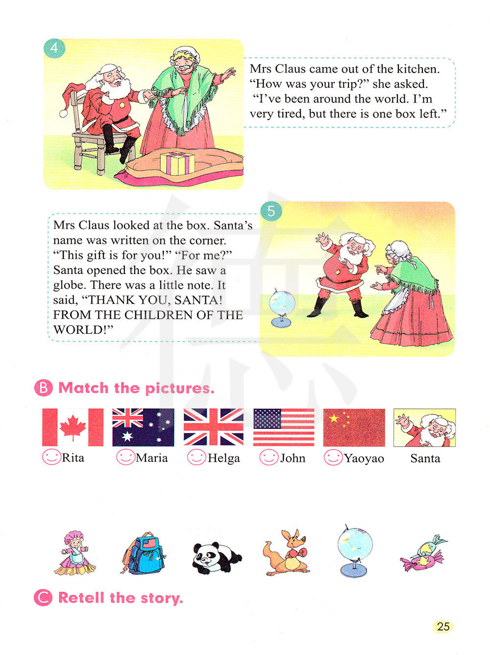 克劳斯夫人看了下盒子。圣诞老人的名字写在角落里。“这是给你的礼物!”“给我的?”圣诞老人打开盒子。他看到一个地球仪。 上面有个小笔记。写着:“谢谢,圣诞老人!来自世界各地的孩子们!