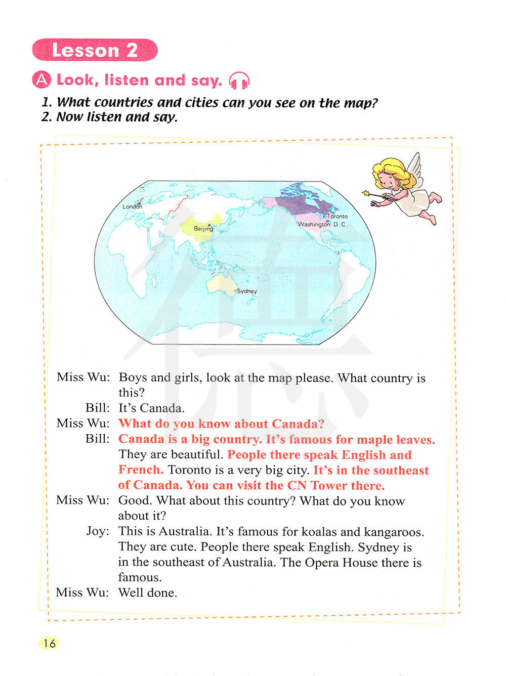 加拿大是个很大的国家。它以枫叶出名。枫叶很漂亮。那里的人们讲英语和法语。多伦多是个很大的城市。它位于加拿大的东南部。你可以在那参观加拿大国家电视塔。