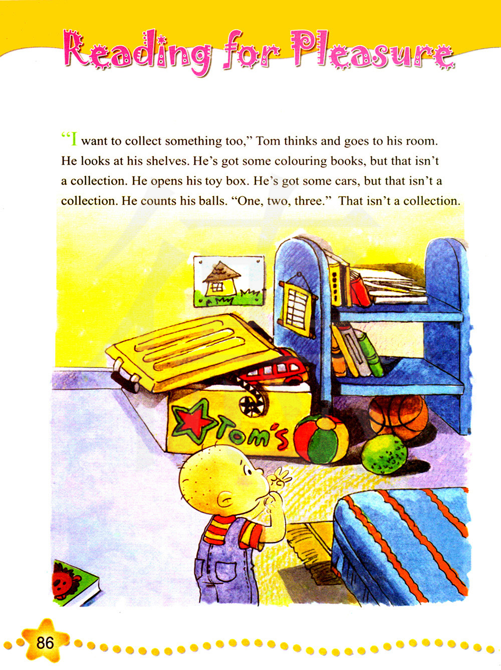 “我也想收集什么东西,”汤姆这样想着,进了他的房间。 他看了看他的书架。他有一些填色本,但那不算一种收集。 他打开他的玩具箱。它有一些汽车,但那不算一种收集。 他数他的球。“一,二,三。”那不算一种收集。