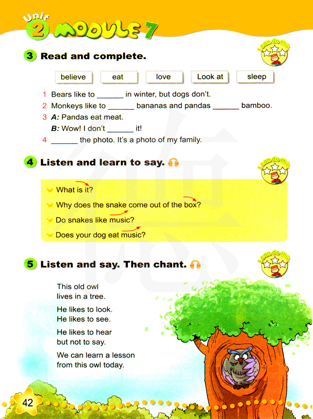 这只老猫头鹰住在树上。 他喜欢看一看。 他喜欢看一看。 他喜欢听一听但不是说一说。 我们今天可以从这只猫头鹰身上学到一个教训。