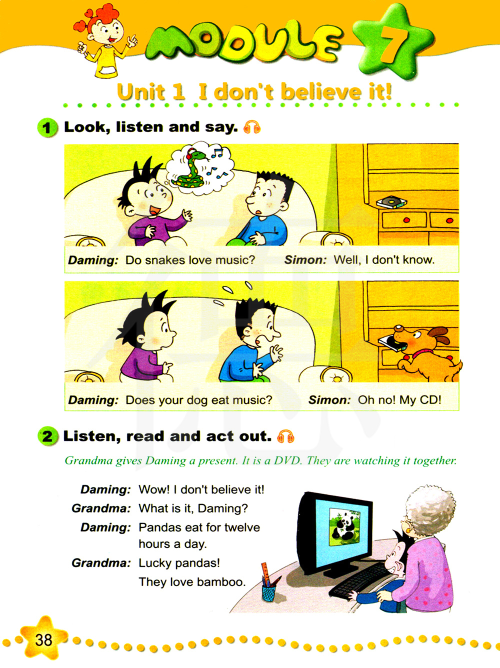 【难点】:第三人称(he, she, it)的动词后加s,如eats ,says等。