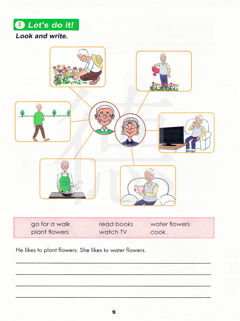 他喜欢种花。她喜欢浇花。