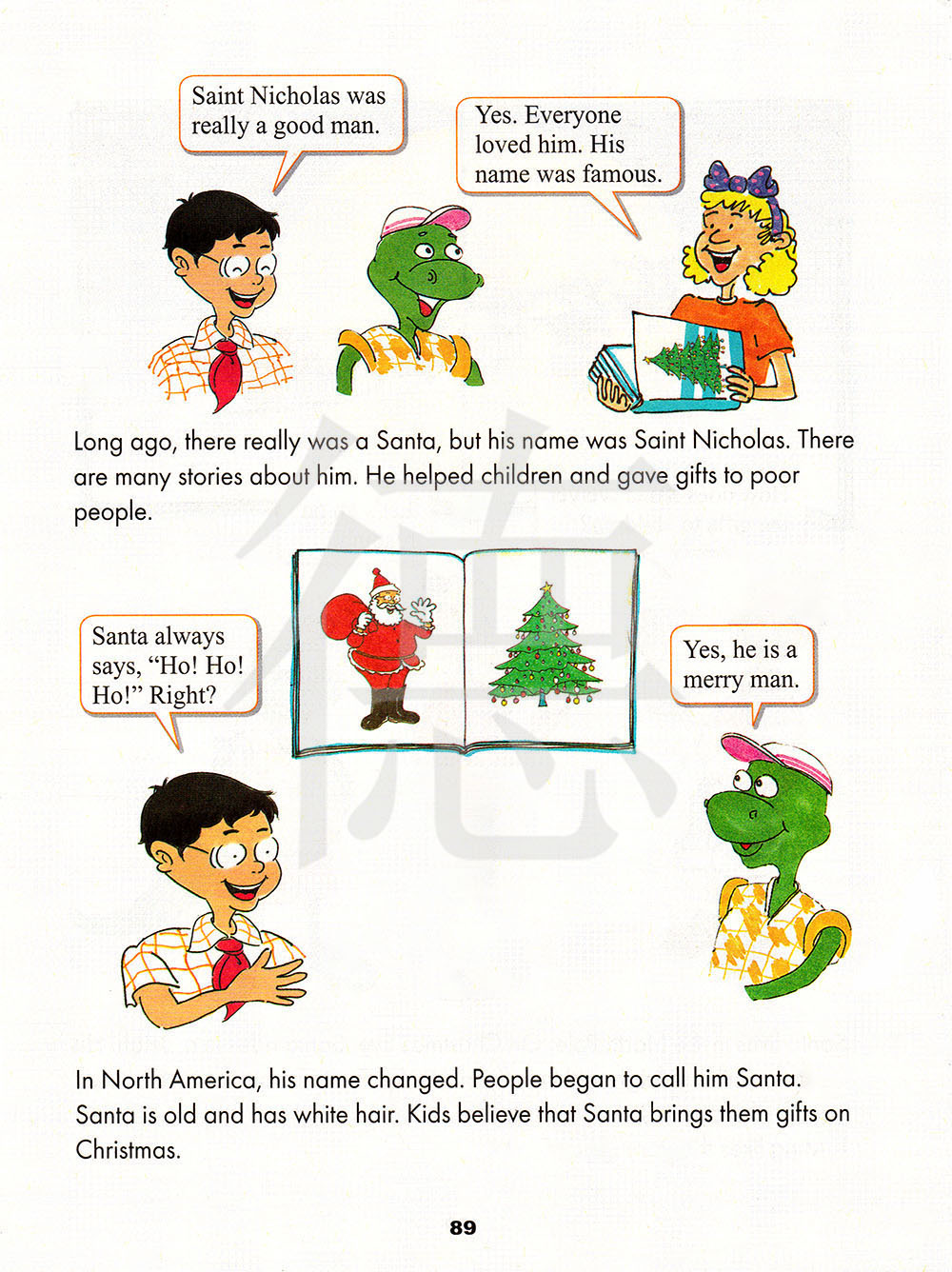 在北美,他的名字改变了。人们开始叫他圣诞老人。圣诞老人是一个年老的,有着白色头发的人。孩子们相信在圣诞节,圣诞老人会给他们带来礼物。