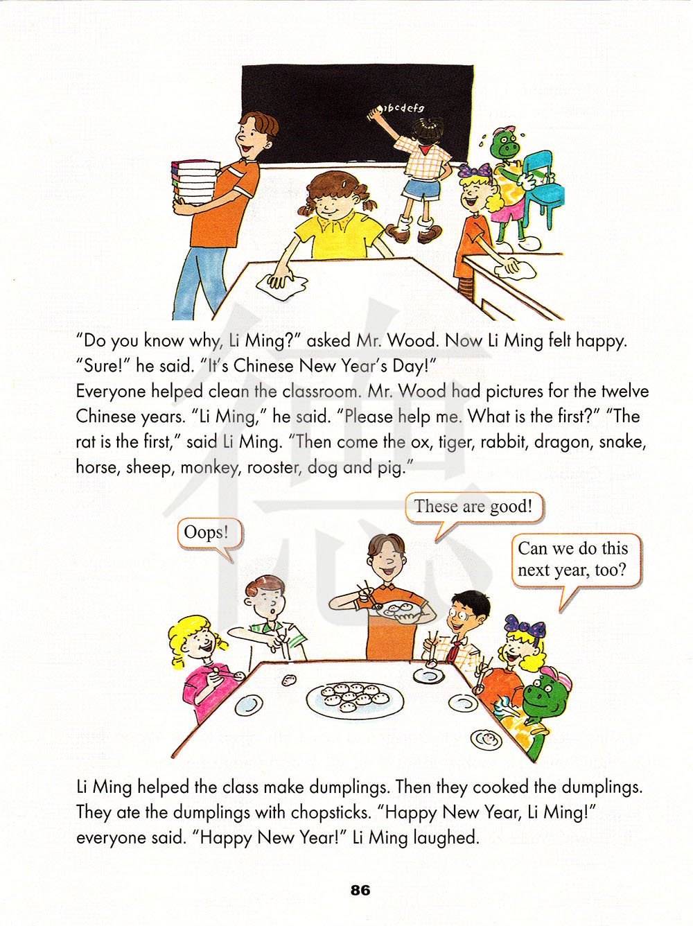 “你知道为什么吗,李明?”伍德先生问。现在李明感到很开心。“当然!”他说。“是中国的新年!”