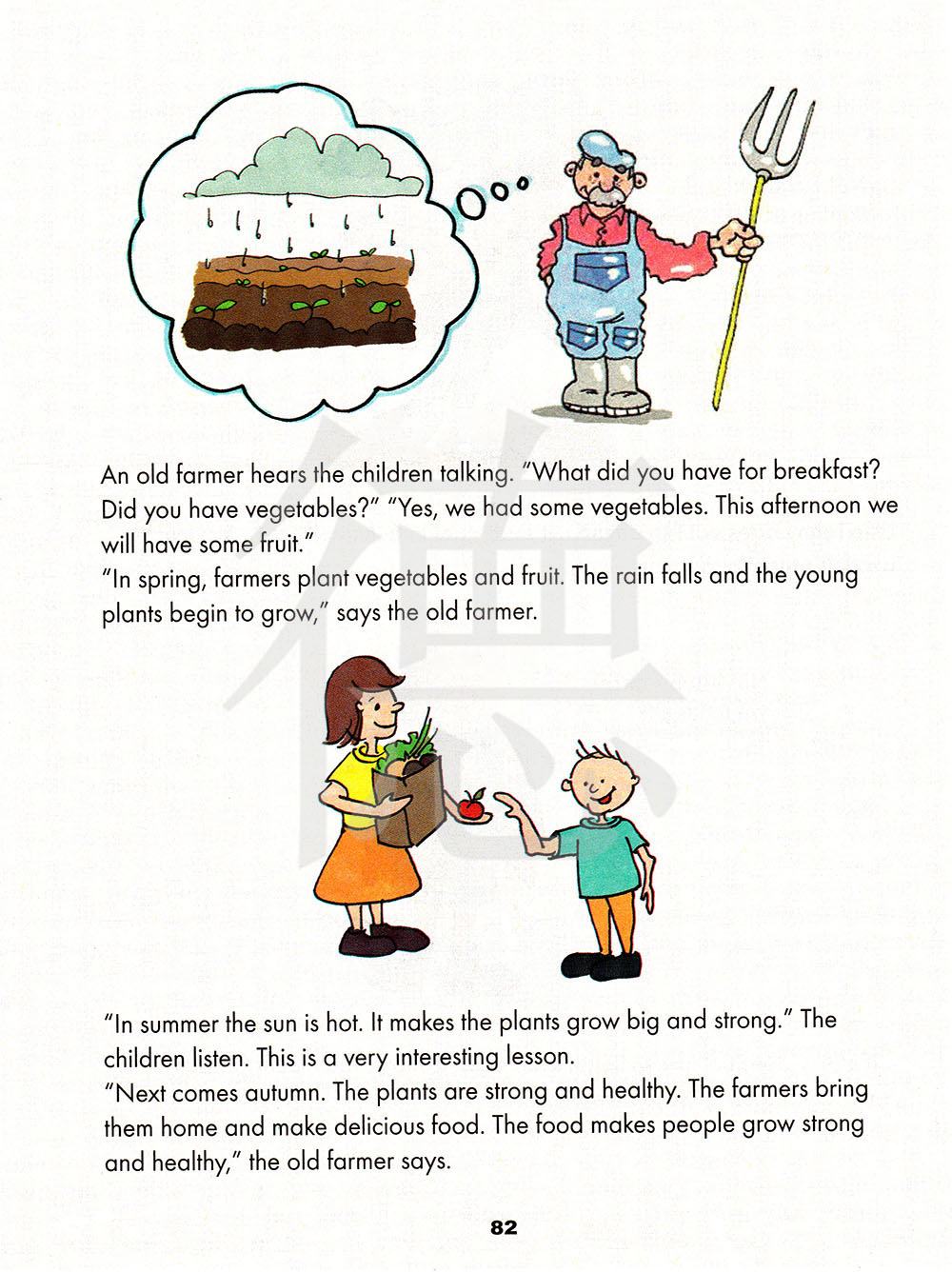在春天,农夫种植蔬菜和水果。下雨了,小植物就开始生长,”老农夫说。