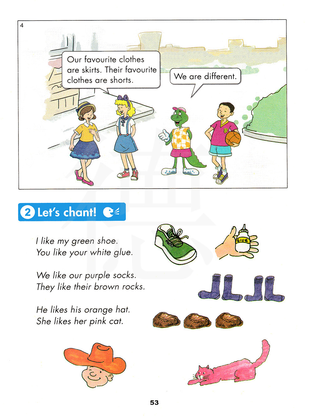 我喜欢我的绿色鞋子。你喜欢你的白色胶水。我们喜欢我们的紫色短袜。他们喜欢他们的棕色岩石。他喜欢他的橙色帽子。她喜欢她的粉红色小猫。