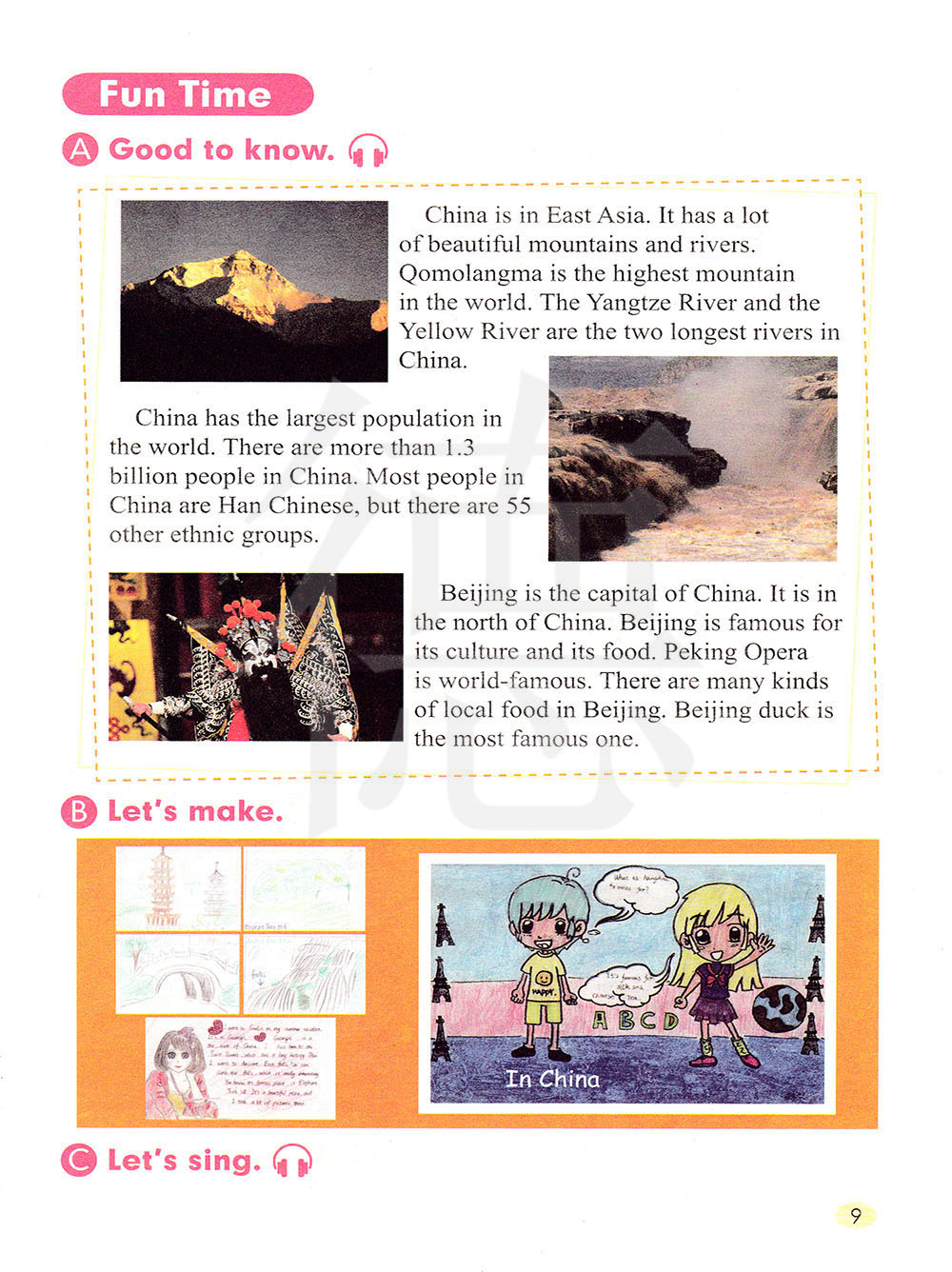 中国位于东亚。它有很多美丽的山和河流。珠穆朗玛峰是世界最高的山峰。 长江和黄河是中国最长的河流。