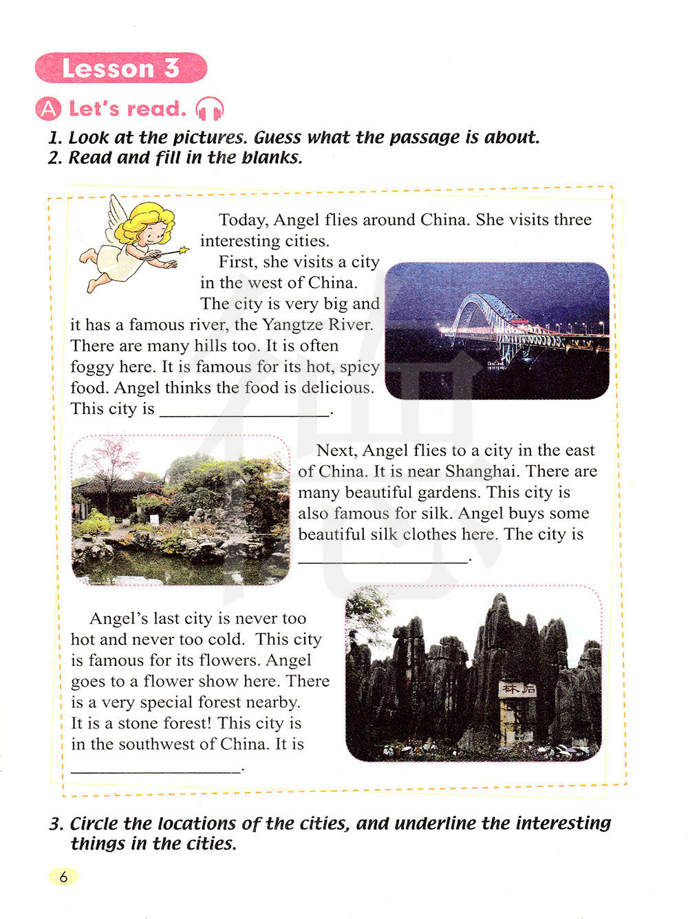 然后,天使飞到了东部的一个城市。它在上海附近。有很多漂亮的园林。这个城市也以丝绸著名。天使在这儿买了些漂亮的丝绸衣服。这个城市是。