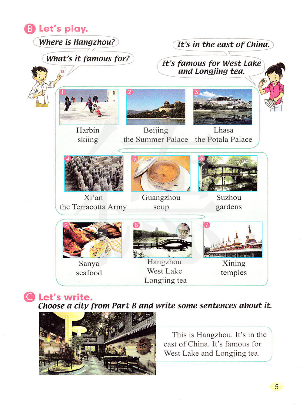 这就是杭州。它位于中国东部。它以西湖和龙井茶出名。