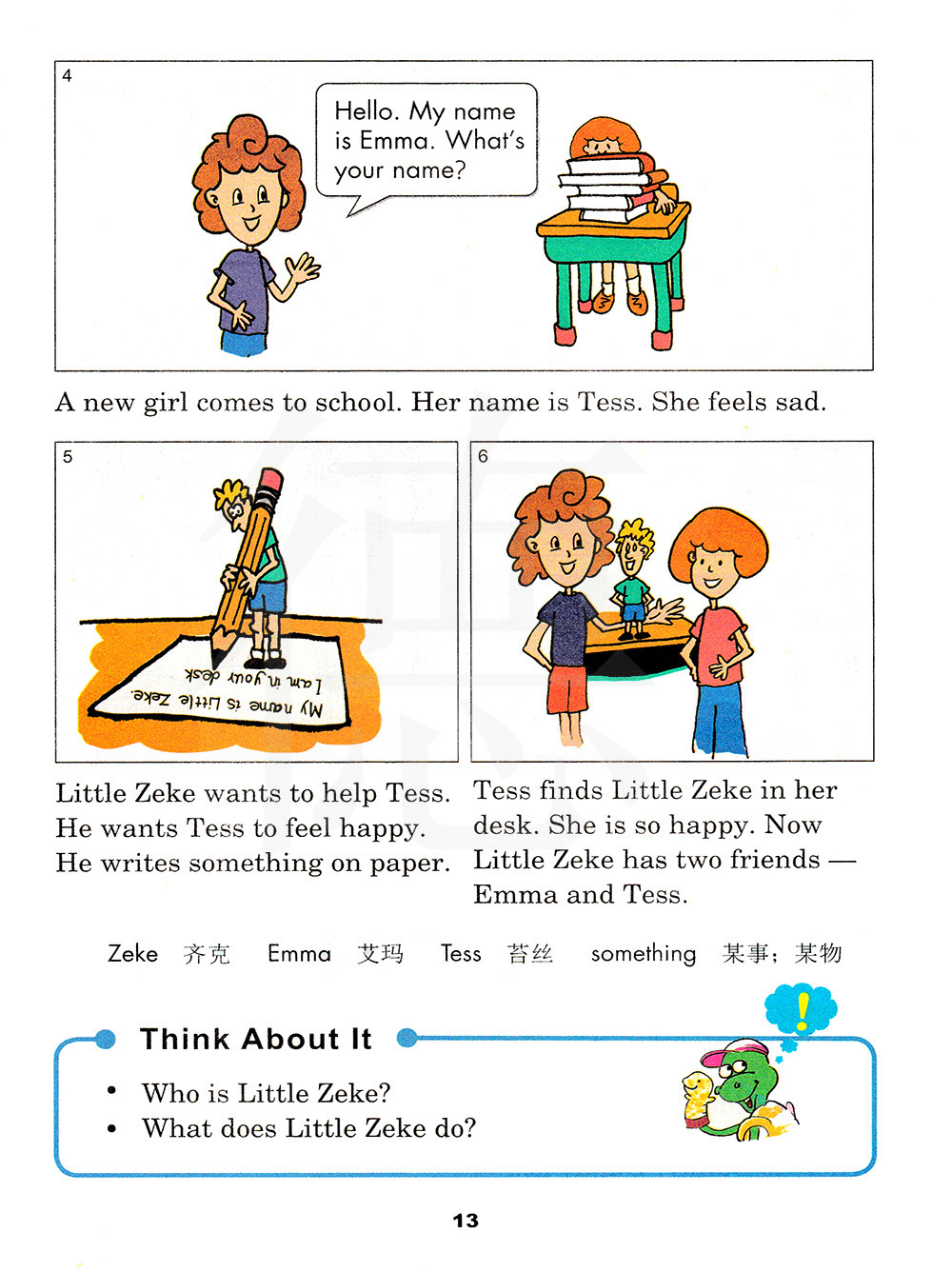 苔丝发现了小齐克在她的课桌里。她很开心。现在小齐克有两个朋友了——艾玛和苔丝。