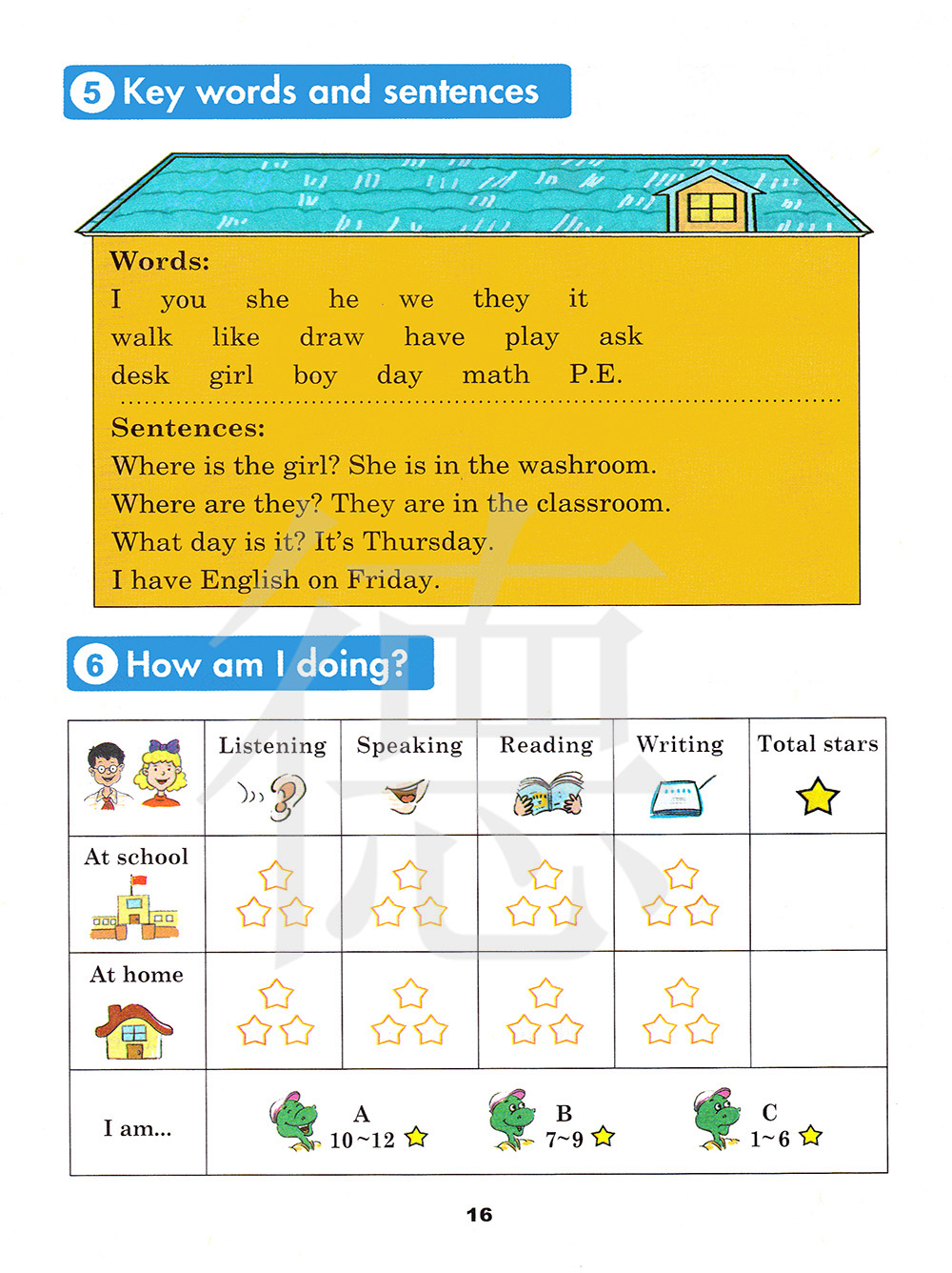 单词 我 你 她 他 我们 他们 它 步行 喜欢 画画 有 玩 问 课桌 女孩 男孩 一天 数学 体育