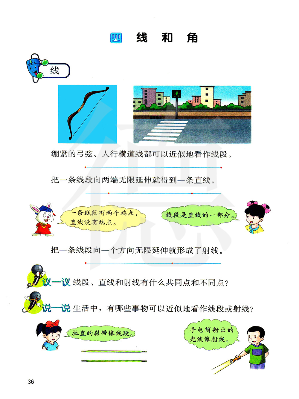 <p style="line-height: 28px; margin: 0px 0px 10px; padding: 0px; color: rgb(245, 245, 245); font-family: 'Hiragino Sans GB W3', 'Hiragino Sans GB', Arial, Helvetica, simsun, u5b8bu4f53; font-size: 16px; text-indent: 2em; background-color: rgb(204, 206, 208);"> <span style="font-size:22px;"><span style="color:#000000;">四单元:线和角 </span></span></p> <p style="line-height: 28px; margin: 0px 0px 10px; padding: 0px; color: rgb(245, 245, 245); font-family: 'Hiragino Sans GB W3', 'Hiragino Sans GB', Arial, Helvetica, simsun, u5b8bu4f53; font-size: 16px; text-indent: 2em; background-color: rgb(204, 206, 208);"> <span style="font-size:22px;"><span style="color:#000000;">1,与曲线折线不同,线段、射线、直线都是直直的。而线段有(两个)端点,有一定长度能(测量)。射线有(一个)端点,无限长。直线无端点,也无限长。</span></span></p> <p style="line-height: 28px; margin: 0px 0px 10px; padding: 0px; color: rgb(245, 245, 245); font-family: 'Hiragino Sans GB W3', 'Hiragino Sans GB', Arial, Helvetica, simsun, u5b8bu4f53; font-size: 16px; text-indent: 2em; background-color: rgb(204, 206, 208);"> <span style="font-size:22px;"><span style="color:#000000;">2,为什么两个钉子就能固定木板? 因为两点确定一条直线!</span></span></p> <p style="line-height: 28px; margin: 0px 0px 10px; padding: 0px; color: rgb(245, 245, 245); font-family: 'Hiragino Sans GB W3', 'Hiragino Sans GB', Arial, Helvetica, simsun, u5b8bu4f53; font-size: 16px; text-indent: 2em; background-color: rgb(204, 206, 208);"> <span style="font-size:22px;"><span style="color:#000000;">为什么从A到B小狗要走直线? 因为两点之间线段最短!</span></span></p> <p style="line-height: 28px; margin: 0px 0px 10px; padding: 0px; color: rgb(245, 245, 245); font-family: 'Hiragino Sans GB W3', 'Hiragino Sans GB', Arial, Helvetica, simsun, u5b8bu4f53; font-size: 16px; text-indent: 2em; background-color: rgb(204, 206, 208);"> <span style="font-size:22px;"><span style="color:#000000;">距离:两点之间线段的长度,叫做两点间的距离。</span></span></p> <p style="line-height: 28px; margin: 0px 0px 10px; padding: 0px; color: rgb(245, 245, 245); font-family: 'Hiragino Sans GB W3', 'Hiragino Sans GB', Arial, Helvetica, simsun, u5b8bu4f53; font-size: 16px; text-indent: 2em; background-color: rgb(204, 206, 208);"> <span style="font-size:22px;"><span style="color:#000000;">3,角由一个(顶点)和两条(边)构成,角的命名详看P39。</span></span></p> <p style="line-height: 28px; margin: 0px 0px 10px; padding: 0px; color: rgb(245, 245, 245); font-family: 'Hiragino Sans GB W3', 'Hiragino Sans GB', Arial, Helvetica, simsun, u5b8bu4f53; font-size: 16px; text-indent: 2em; background-color: rgb(204, 206, 208);"> <span style="font-size:22px;"><span style="color:#000000;">4,要准确知道两个角的大小,可以用(量角器)来测量,计量角的单位是“度”,用符号“。”来表示。把平角平均分成180份,每份就是1度。</span></span></p> <p style="line-height: 28px; margin: 0px 0px 10px; padding: 0px; color: rgb(245, 245, 245); font-family: 'Hiragino Sans GB W3', 'Hiragino Sans GB', Arial, Helvetica, simsun, u5b8bu4f53; font-size: 16px; text-indent: 2em; background-color: rgb(204, 206, 208);"> <span style="font-size:22px;"><span style="color:#000000;">5,角的分类:锐角〈 直角〈 钝角〈 平角〈 周角。注意:钝角是大于90度又小于180度的角。</span></span></p> <p style="line-height: 28px; margin: 0px 0px 10px; padding: 0px; color: rgb(245, 245, 245); font-family: 'Hiragino Sans GB W3', 'Hiragino Sans GB', Arial, Helvetica, simsun, u5b8bu4f53; font-size: 16px; text-indent: 2em; background-color: rgb(204, 206, 208);"> <span style="font-size:22px;"><span style="color:#000000;">6,会用量角器画任意角,会用三角尺画特殊度数的角。如30度、45度、90度、60度、15度、75度、105度,120度135度、150度。</span></span></p>题库