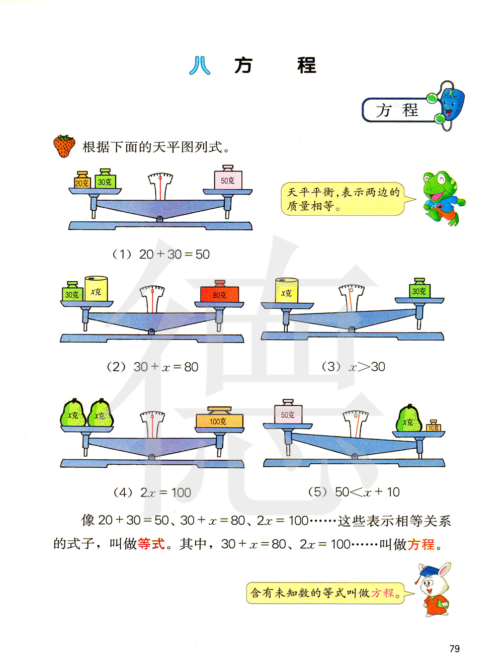知识点2:方程的概念:含有未知数的等式叫方程,方程中一定含有未知数,而且必须是等式,二者缺一不可.
