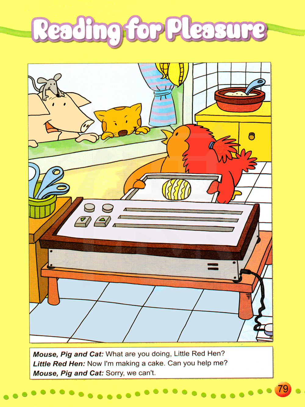 你正在做什么,红色的小母鸡?我现在在做蛋糕,你们能帮助我吗?对不起,我们不能。
