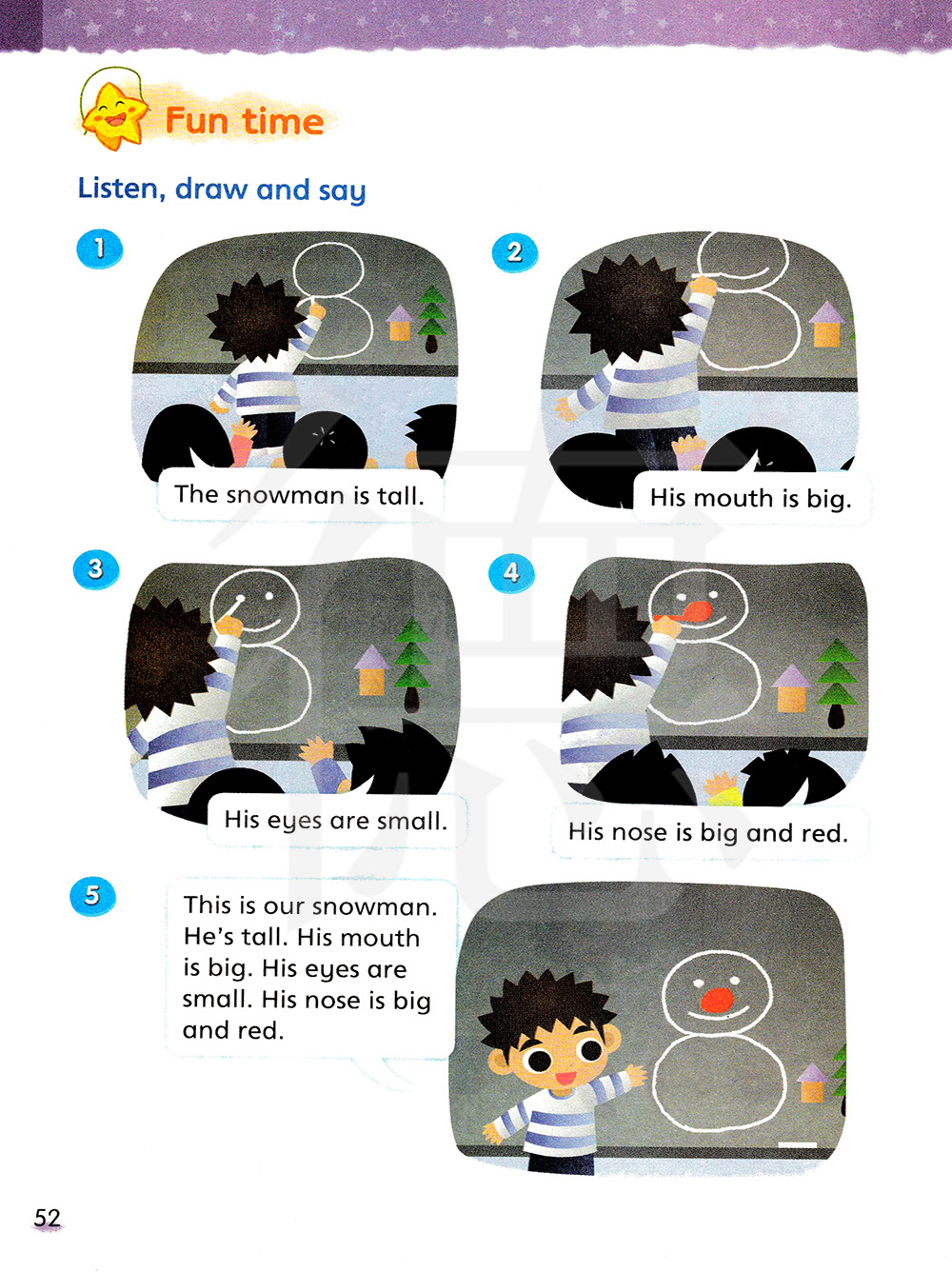 这是我们的雪人,他很高,他鼻子很大,她眼睛很小,他鼻子很大而且是红色的。