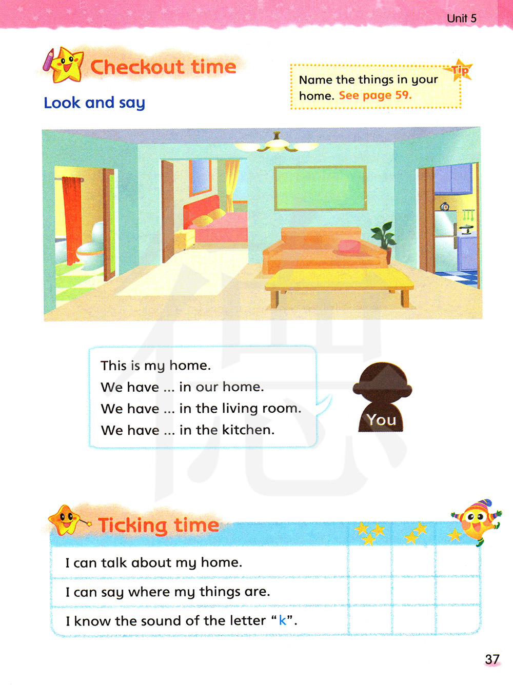 假设这是你家的房子,请你仔细看看这个房子里的一些物品和家具摆设,然后参考下面的句型来介绍一下你的家吧。