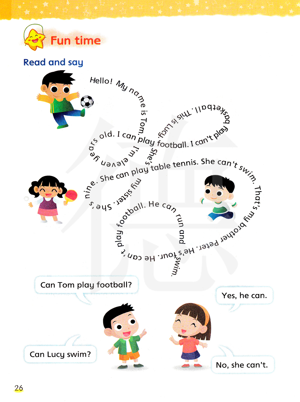 你好,我叫汤姆,我十一岁,我会踢足球,我不会打篮球; 她是露西,她是我妹妹,她九岁了,她会打台球,她不会游泳; 他是我弟弟彼得,他四岁了,他不会踢足球,他会跑步和游泳