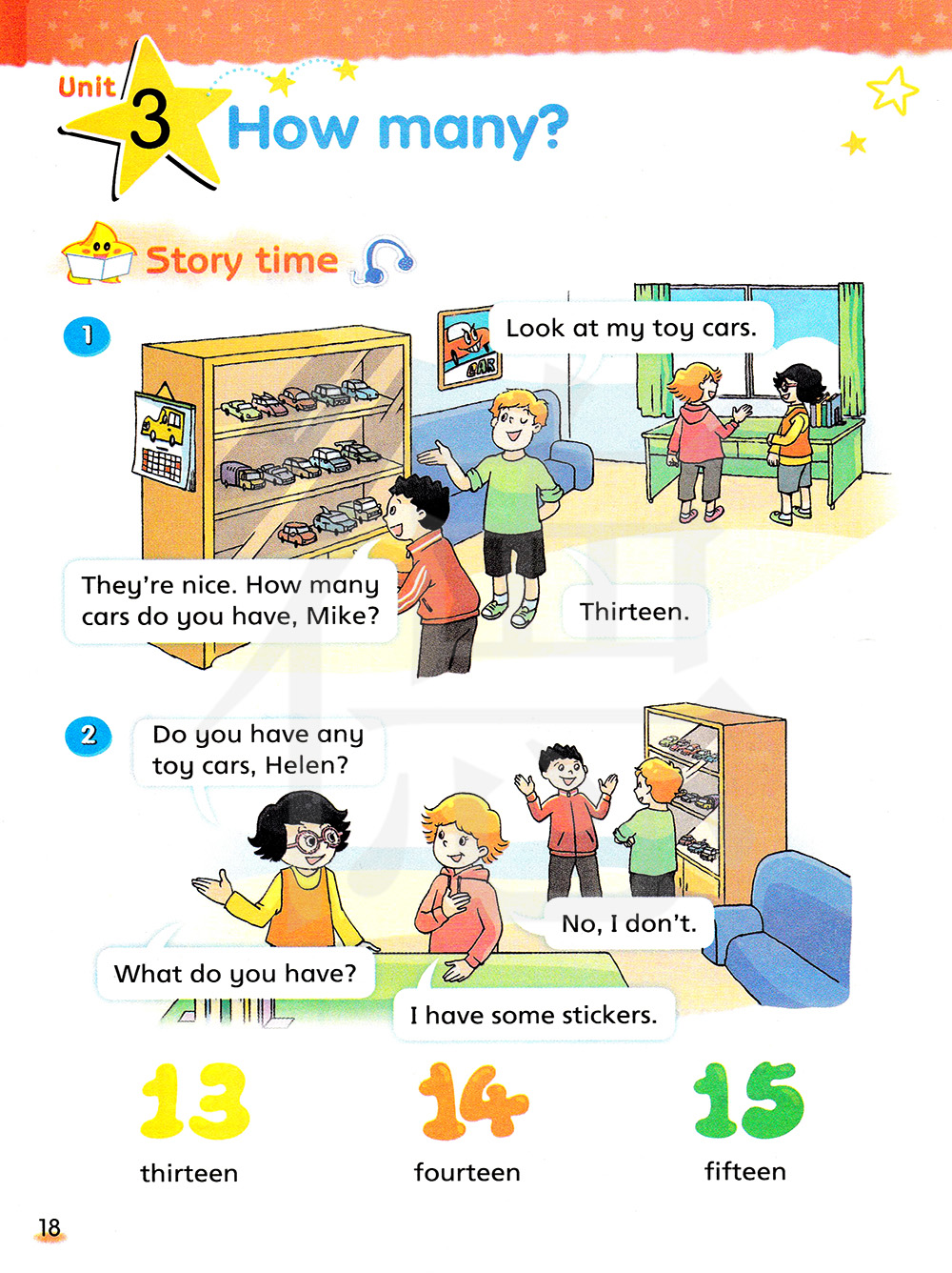 2、How many stickers do you have?你有多少贴画? I have fifteen stickers?我有15张贴画。
