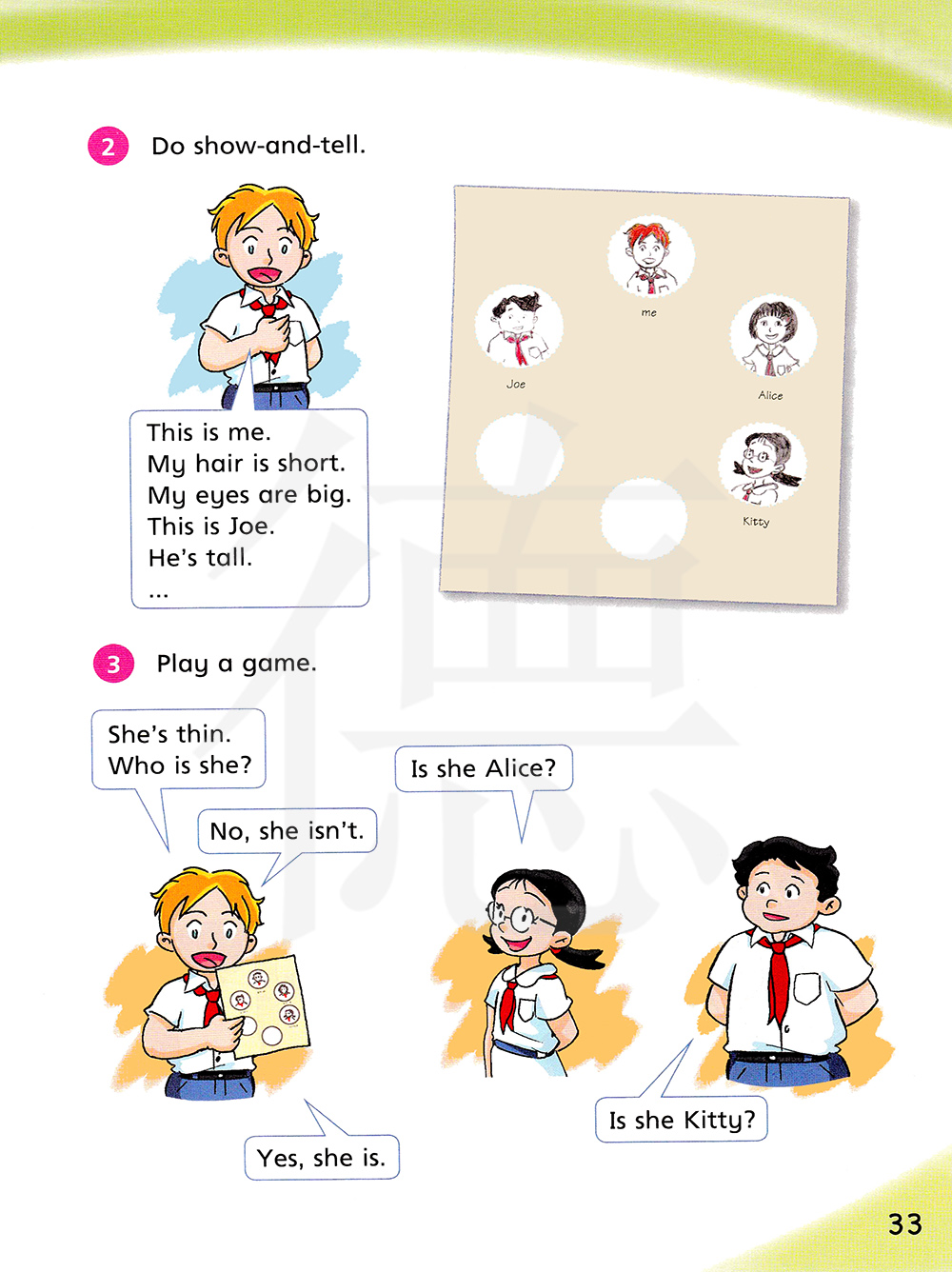 这是我,我的头发很短,我的眼睛很大。这是乔,他很高。