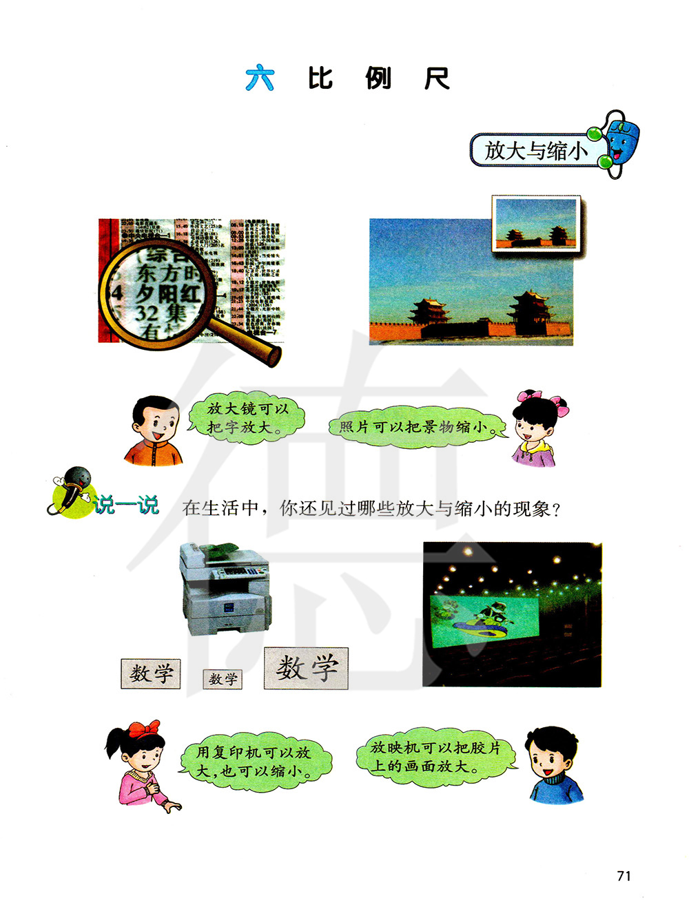 1.放大与缩小的概念: 形状不变,大小发生变化。