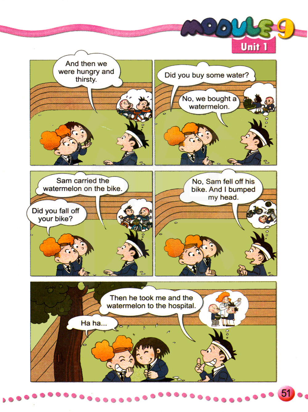 萨姆骑着车拿着西瓜。