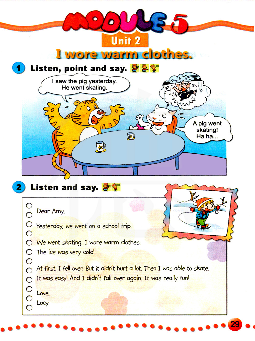 我们去滑冰。我穿了暖和的衣服。 冰很冷。