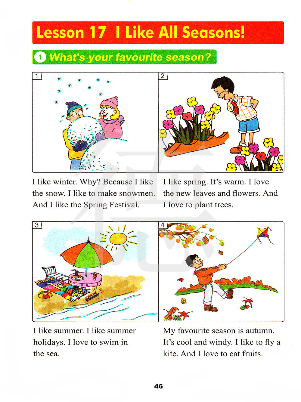 我最喜欢的季节是秋天。它很凉爽和多风。我喜欢放风筝。我爱吃水果。