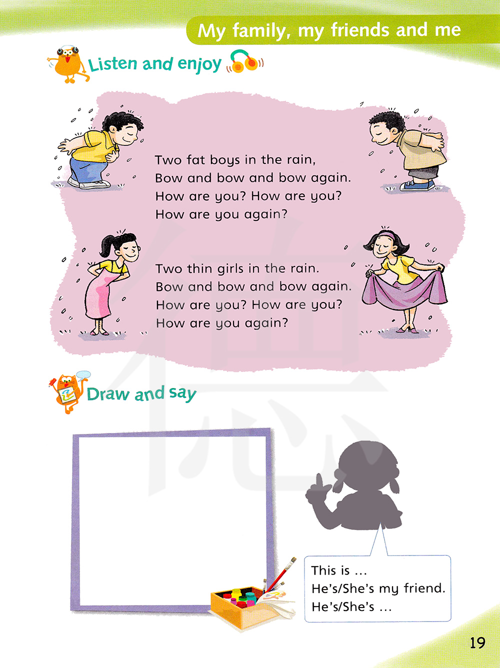两个胖男孩再雨中,鞠躬鞠躬再鞠躬,你好吗?你好吗?你好吗?两个瘦女孩在雨中,鞠躬鞠躬再鞠躬,你好吗?你好吗?你好吗?