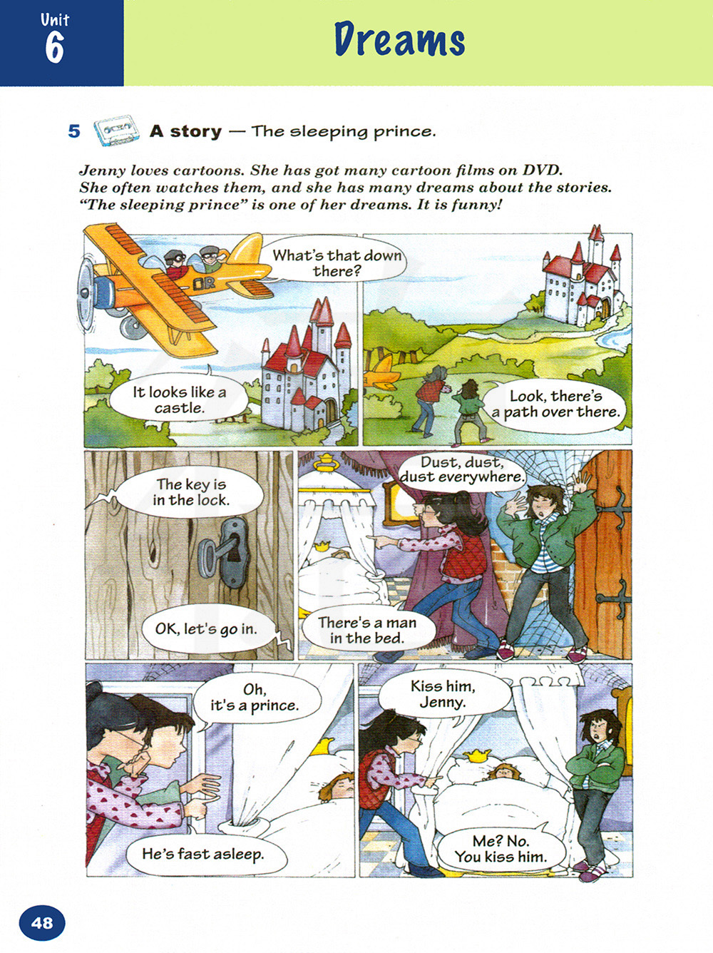 珍妮喜欢卡通片。她DVD里有很多卡通电影。他经常看,她做了许多关于那些故事的梦。“沉睡的王子”是她的一个梦。它非常有趣!
