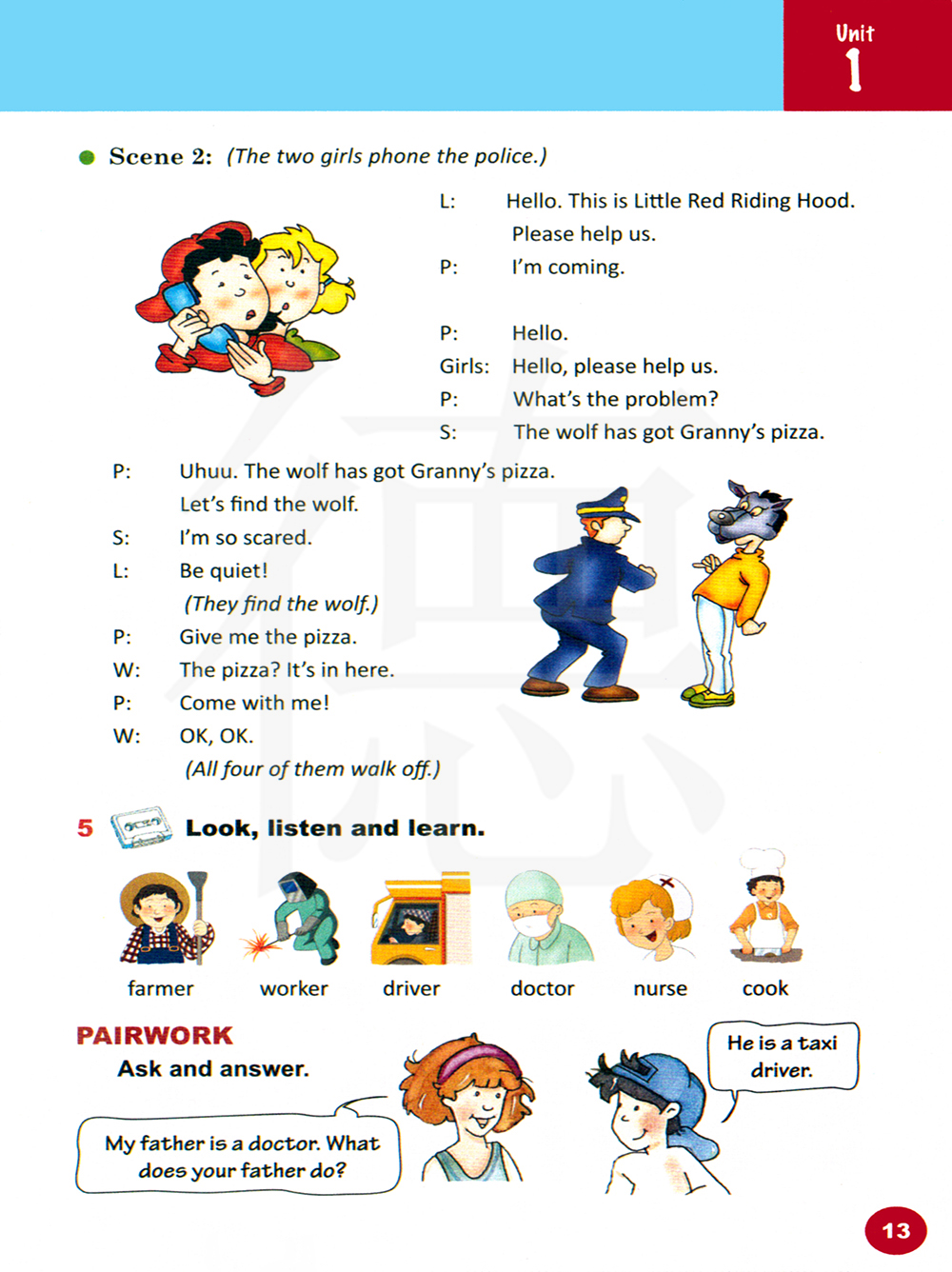 你好。你好,请求你帮助我们。出什么事了?狼拿去了奶奶的比萨饼。