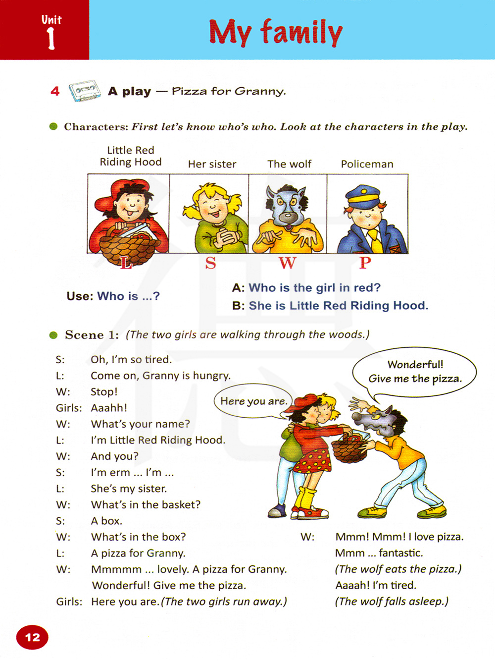篮子里是什么?一个盒子。盒子里是什么?给奶奶的比萨饼。恩......真可爱。给奶奶的比萨饼。太好了!给我比萨饼。给你。(两个女孩逃跑了。)