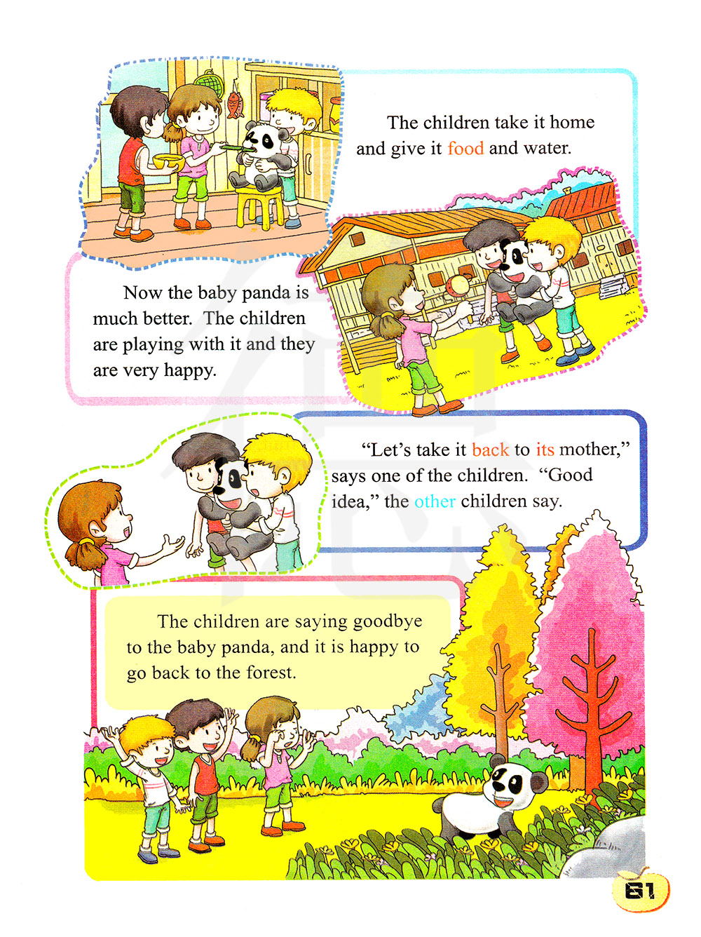 孩子们正在跟熊猫宝宝告别, 它很开心再次回到森林里。