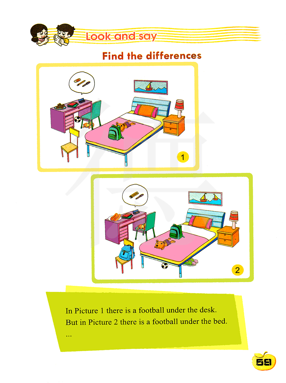 在图1中桌子下面有一个足球,但是在图2中床下面有一个足球。