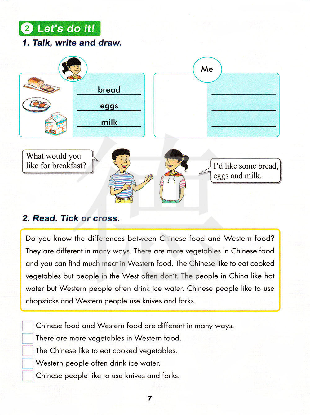 你知道中西方食物的区别吗? 它们在许多方面都不同。中餐有更多的蔬菜,而在西餐里你可以找到许多的肉类食物。中国人喜欢烹饪蔬菜而西方人则不喜欢这么做。 中国人喜欢喝开水而西方人通常喜欢喝冰水。中国人喜欢用筷子而西方人使用刀叉。