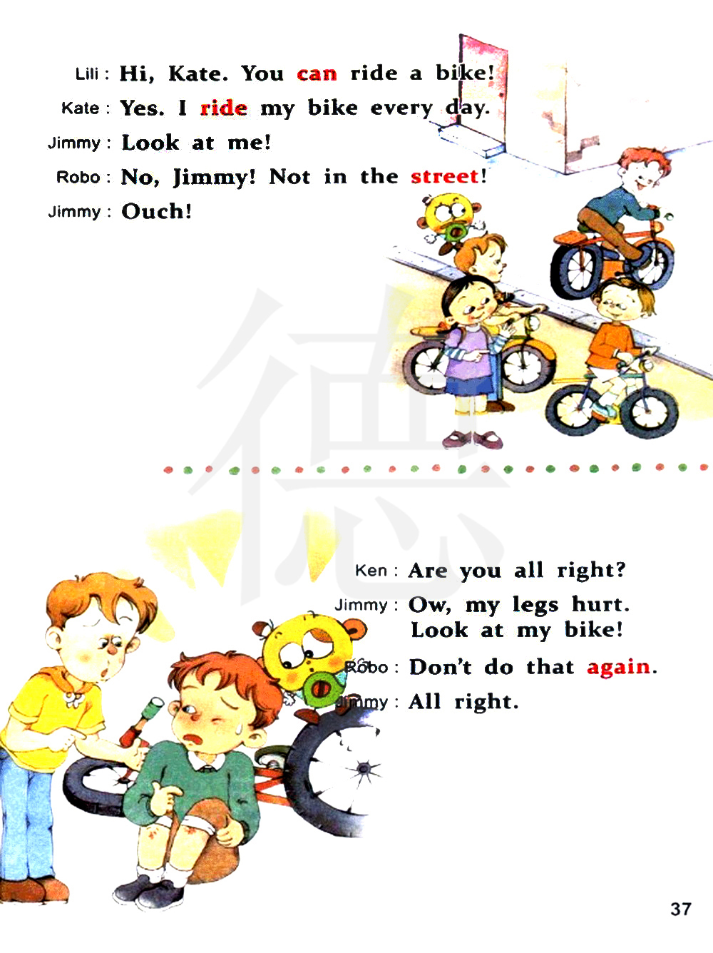 你还好吗?噢,我的腿受伤了。看我的自行车!