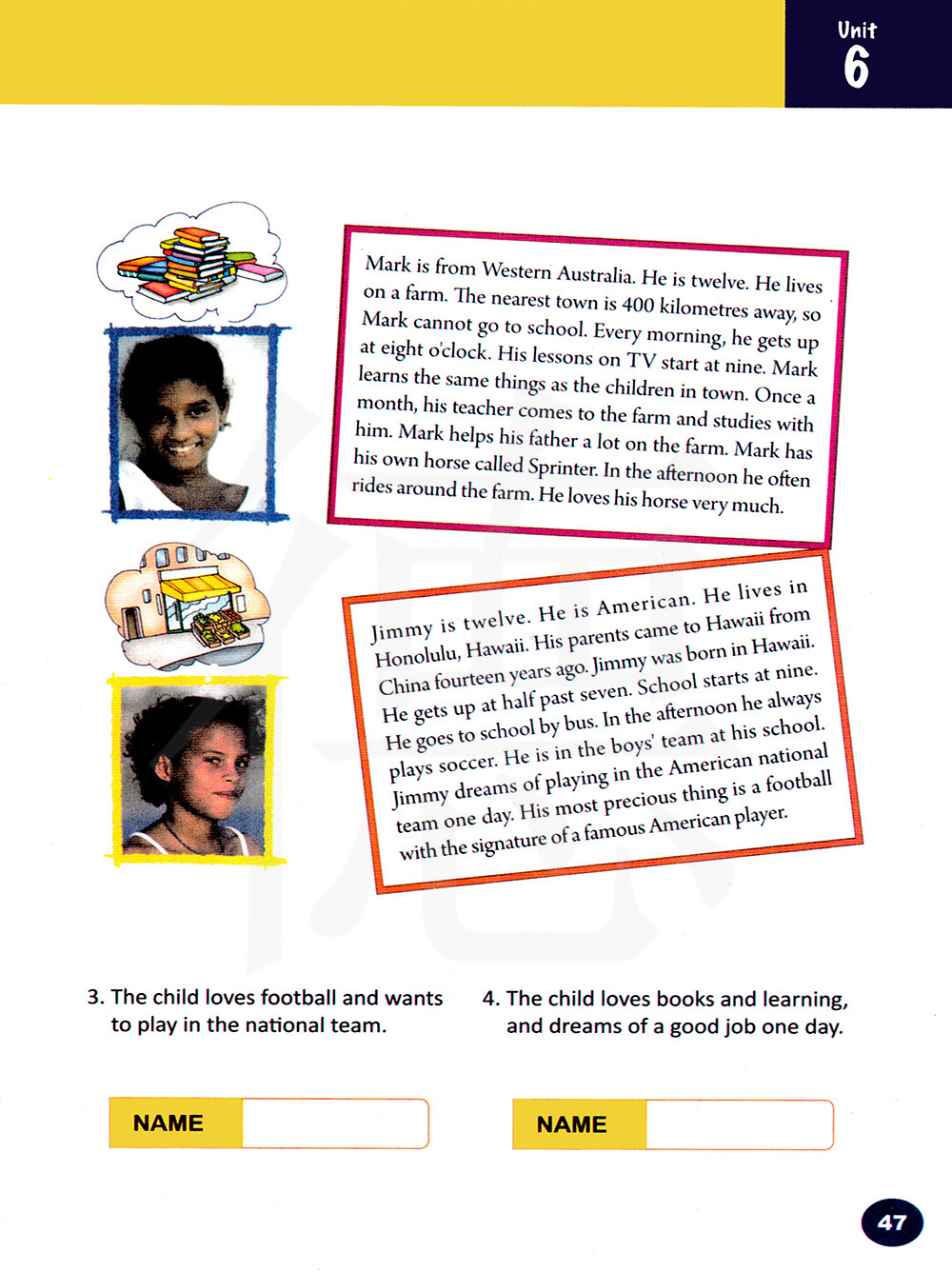 吉米12岁,他是美国人,他住在夏威夷火奴鲁鲁。他的父母十四年前从中国来到夏威夷,吉米出生在夏威夷。他七点半起床,学校九点开始上课,他乘公共汽车去上学,下午的时候他总是踢足球,他在学校的男队里,吉米梦想有一天能在美国国家足球队里踢球,他最珍贵的东西是一个有一名著名美国球员签名的足球。