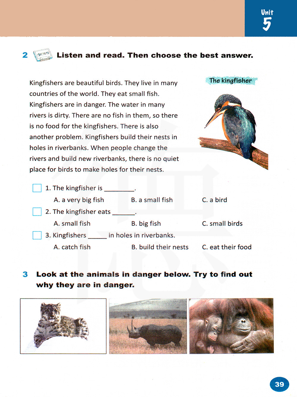 翠鸟是漂亮的鸟类,它们生活在世界上很多国家。它们吃小鱼。翠鸟处于危险中。许多河流的水都很脏,那些河里没有鱼,所以翠鸟没有食物。还有另外一个问题,翠鸟把巢筑在河岸边的洞里。当人们改变河道并修建新的河岸时,就没有安静的地方给鸟儿钻洞筑巢了。