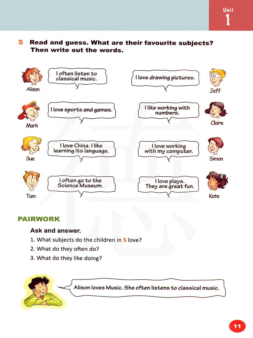 5 读一读并猜一猜。他们最喜欢的科目是什么?然后写出单词。