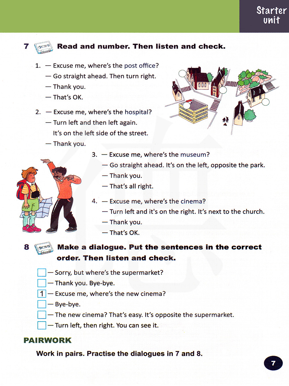 4 打扰一下,电影院在哪里?左转,它在右侧。在教堂旁边。谢谢你。没关系。