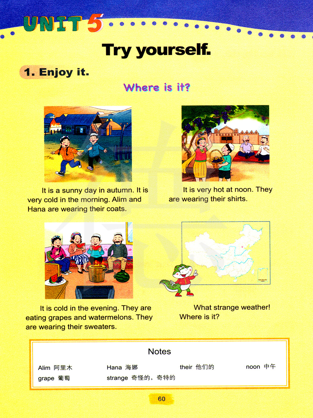 秋季的晴天,早上非常寒冷。阿里木和海納穿着他们的大衣。